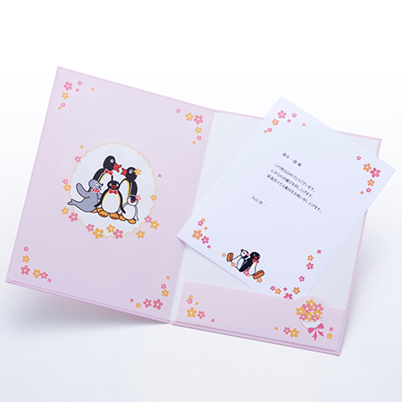 表紙にピングーとピンガが刺しゅうでデザインされたおしゃれ&キュートな電報台紙。なかにはピングーファミリーの幸せそうなワンカット。